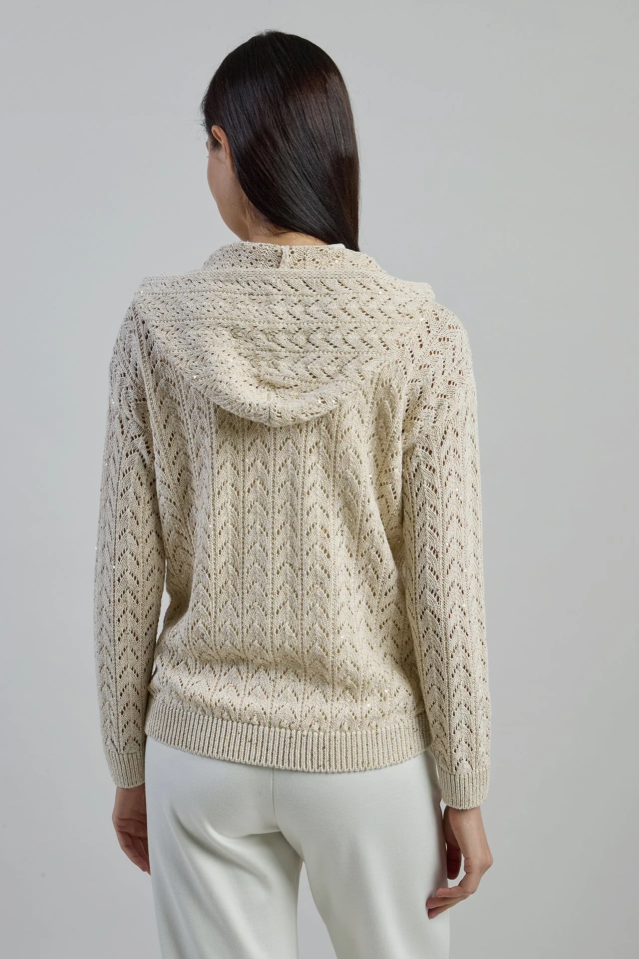 Full-zip hooded sweater in an exclusive twisted cotton-linen yarn, delicately embellished with a subtle sequin thread. The unique knit stitch lends the piece a sophisticated elegance and a refined femininity. A perfect addition to elevate casual-chic looks with a bright, modern touch. Ideal for mid-season styling, effortlessly transitioning from day to evening.