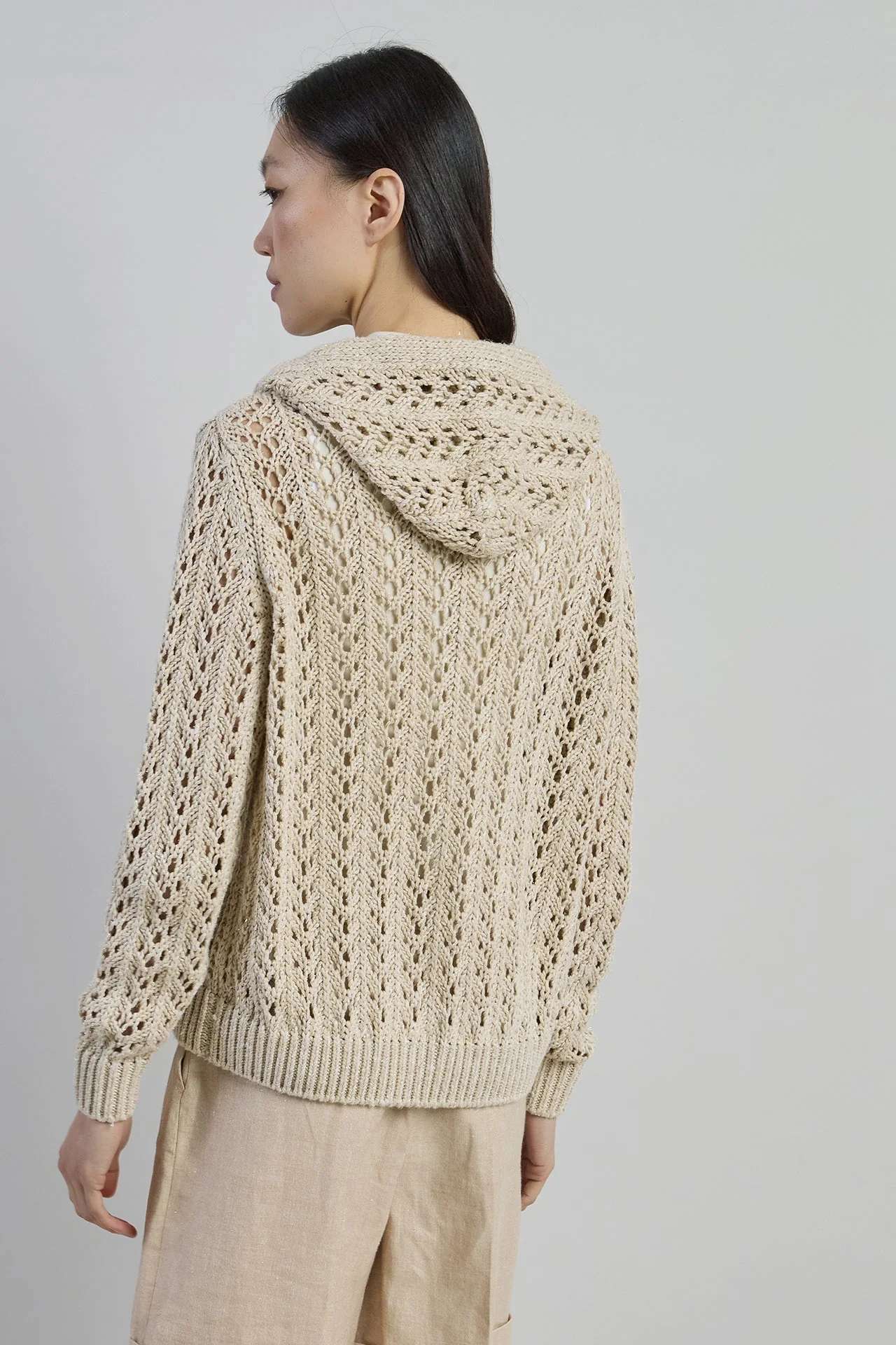Full-zip sweater with long sleeves and hood, woven from a luxurious blend of linen, cotton, and silk. This special composition provides the garment with refined softness and a sophisticated texture, perfect for versatile, chic looks. Ideal for dynamic outfits that seamlessly combine comfort with style.