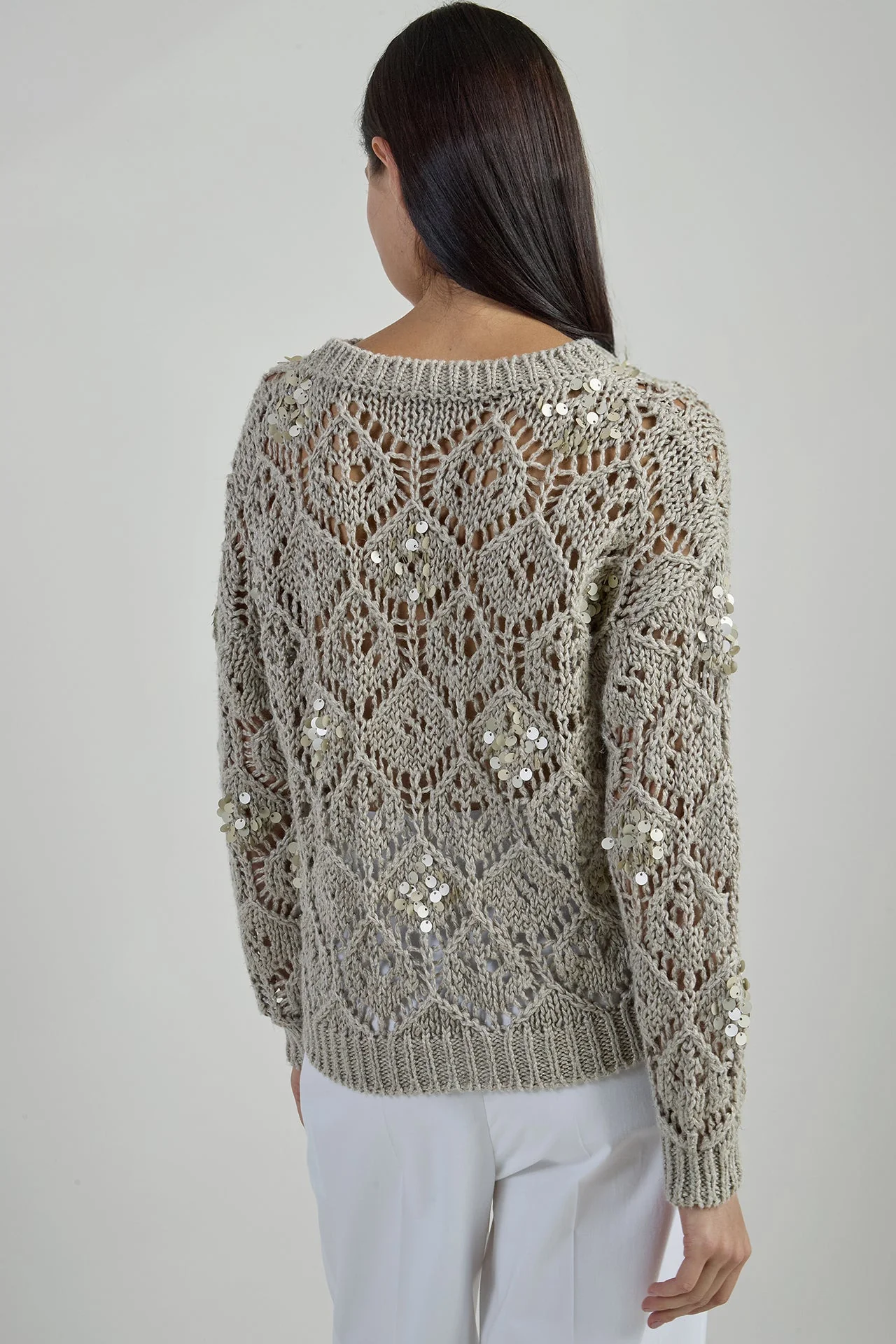 Crew-neck sweater with ribbed drop-stitch, made from a 100% natural coarse linen, gauge 3. This exclusive knit, hand-sewn and embroidered with sequin threads, truly reflects the quality of Italian craftsmanship.