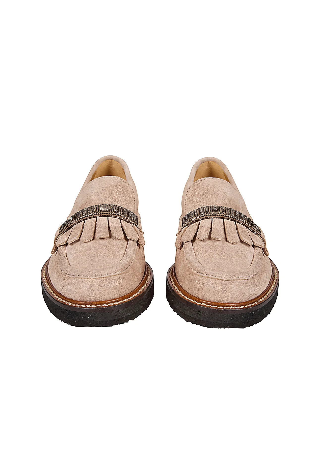 Moccasins with tassels. Crafted from suede in all the colours of the collection, these shoes feature a small rhinestone detail that adds an exclusive and feminine touch.