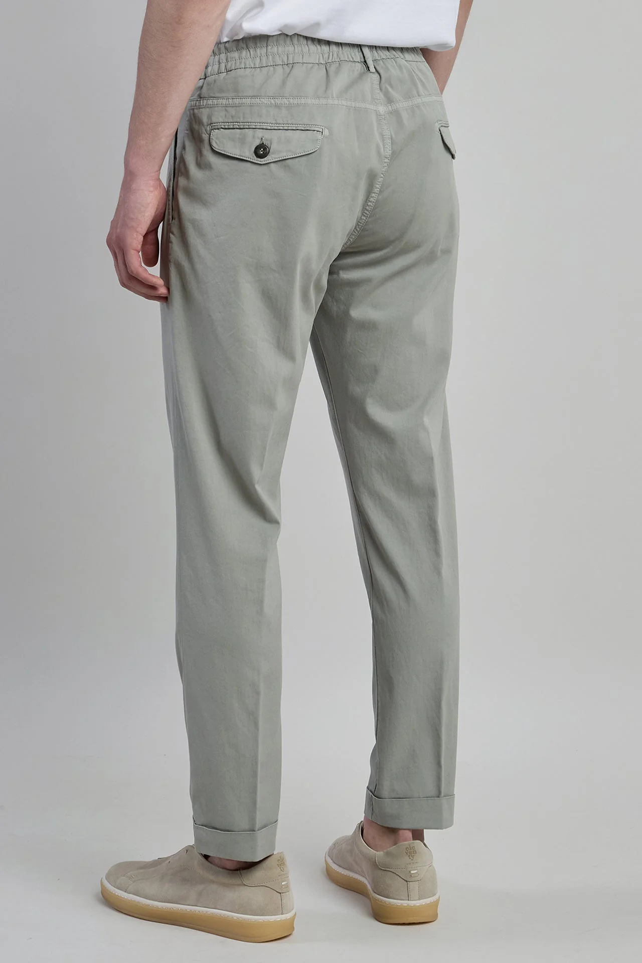 Jogger trousers in fine garment-dyed cotton and silk with drawstring waist and regular fit. The garment-dyeing process accentuates the colour nuances along the seams, creating a worn appearance. Enhanced with intricate sartorial stitches.