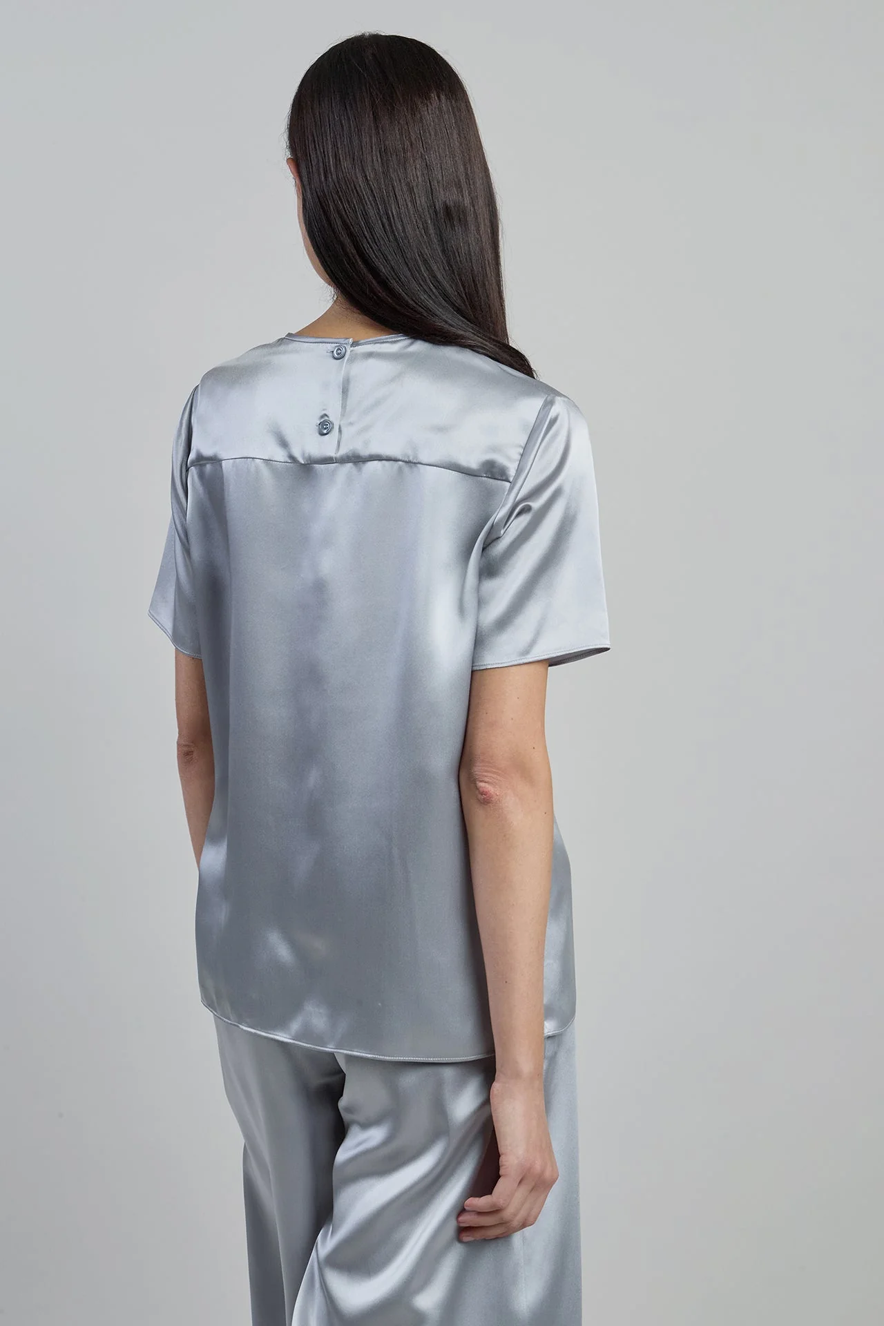Short-sleeve T-shirt in double silk satin, 14 momme. This premium quality Comasca silk gives the garment exceptional lustre and femininity.