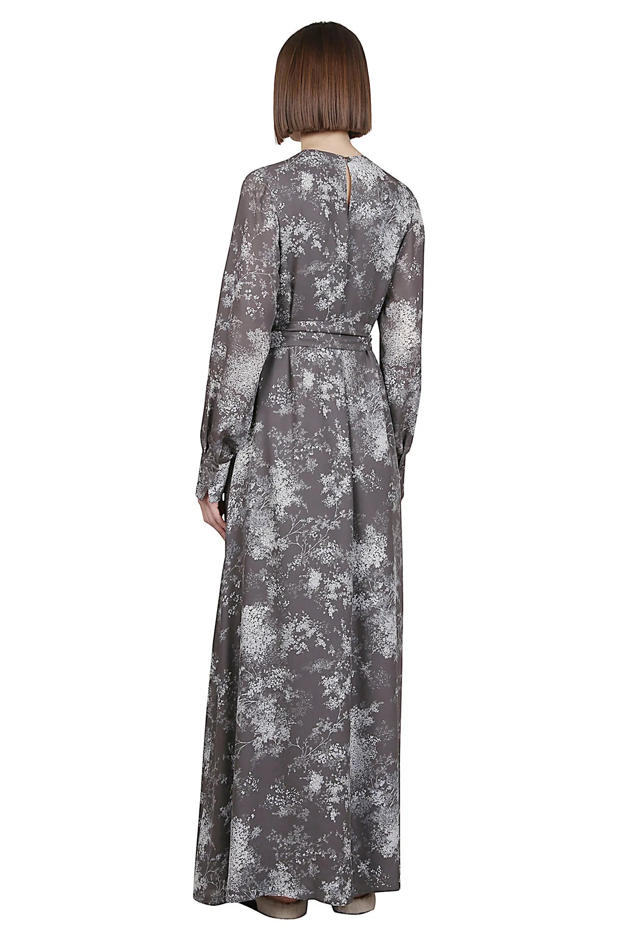 Long crew-neck dress with belt, made of a fine double georgette silk and printed with an exclusive ramage pattern that gives the garment a romantic and feminine look.